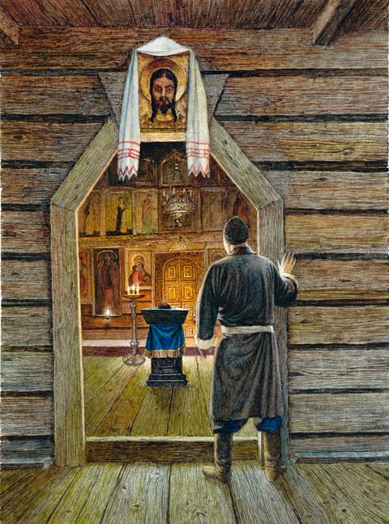 Сотник оборотился и указал ему место в головах умершей, перед небольшим налоем, на котором лежали книги.