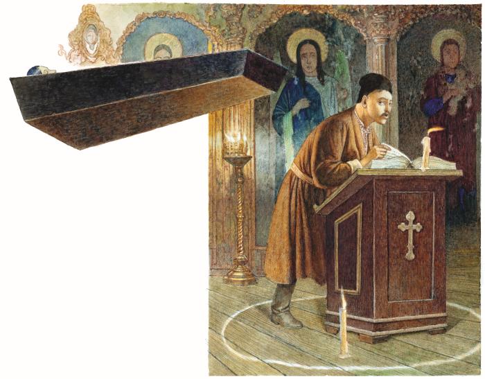 Философ, несмотря на то что успел подкрепить себя доброю кружкою горелки, чувствовал втайне подступавшую робость по мере того, как они приближались к освещенной церкви. Рассказы и странные истории, слышанные им, помогали еще более действовать его воображению. Мрак под тыном и деревьями начинал редеть; место становилось обнаженнее. Они вступили наконец за ветхую церковную ограду в небольшой дворик, за которым не было ни деревца и открывалось одно пустое поле да поглощенные ночным мраком луга. Три козака взошли вместе с Хомою по крутой лестнице на крыльцо и вступили в церковь. Здесь они оставили философа, пожелав ему благополучно отправить свою обязанность, и заперли за ним дверь, по приказанию пана.