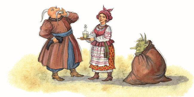 – Нет, ты мне покажешь, негодный пьяница! – вскричала жена, ударив высокого кума кулаком в подбородок и продираясь к мешку.