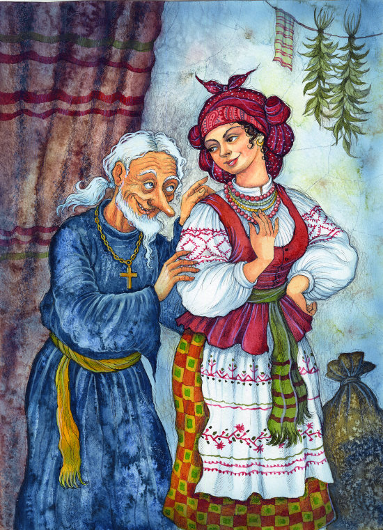 Кумова жена, остолбенев, выпустила из рук ногу, за которую начала было тянуть дьяка из мешка.
