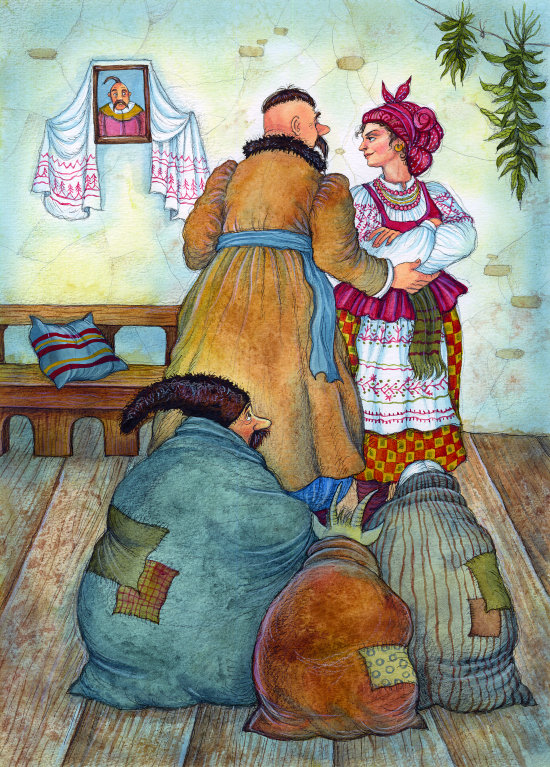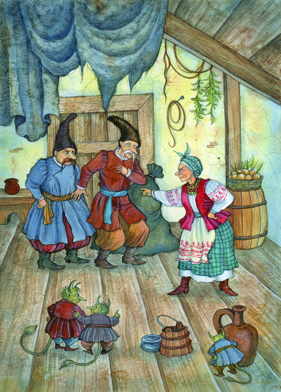 Но ткач и кум мужественно отстояли мешок и заставили ее попятиться назад. Не успели они оправиться, как супруга выбежала в сени уже с кочергою в руках. Проворно хватила кочергою мужа по рукам, ткача по спине и уже стояла возле мешка.