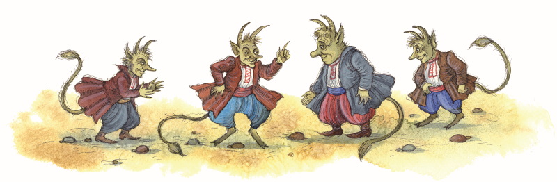 Мороз подрал по коже кузнеца; испугавшись и побледнев, не знал он, что делать; уже хотел перекреститься… Но черт, наклонив свое собачье рыльце ему на правое ухо, сказал: