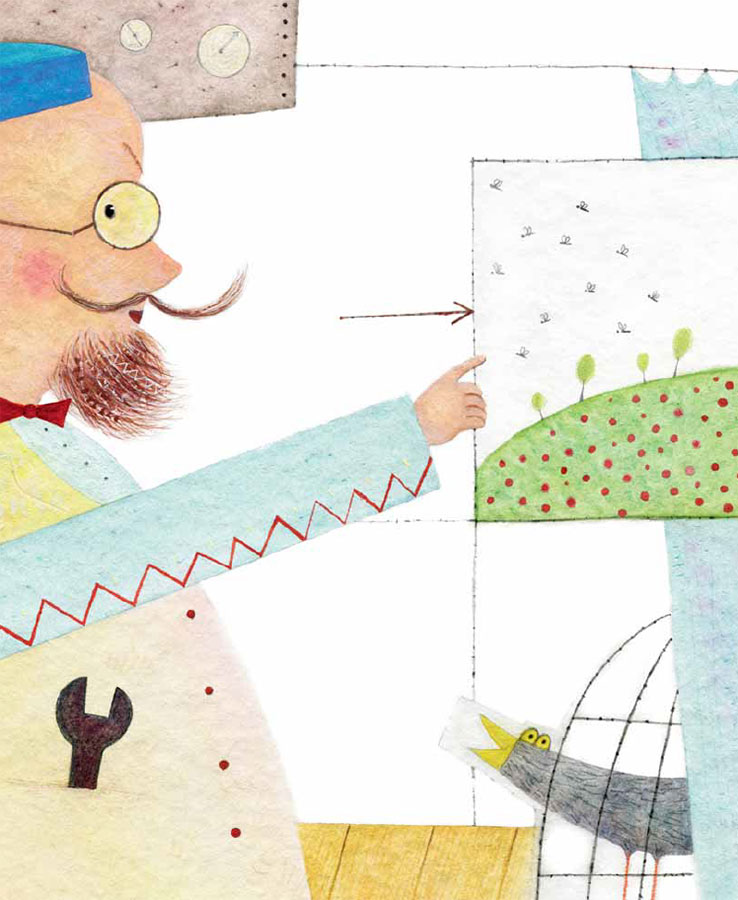 Пройдя вслед за Архимедом Кузьмичом, Ух оказался в захламлённой каморке. Здесь одновременно пахло клеем, опилками и краской. У волчонка защекотало в носу, и он чихнул. Тут же висящий на стене репродуктор старинного вида защёлкал, захрипел и вежливо произнёс: «Будьте здоровы!»