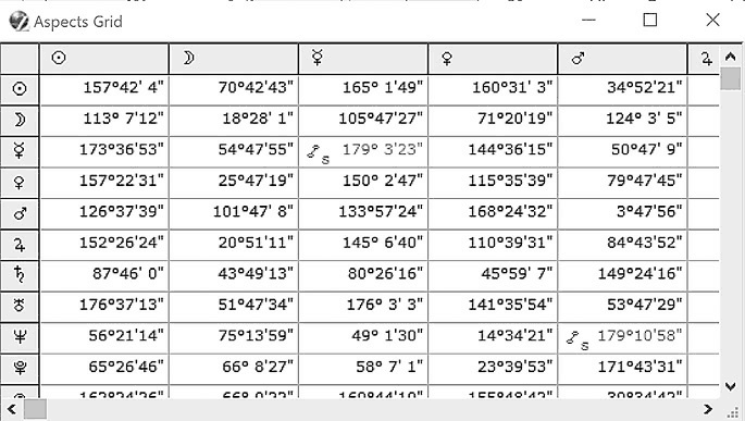• В этом окне вы видите таблицу, в которой и по вертикали, и по горизонтали идут символы планет. Чтобы увидеть все планеты в горизонтальном ряду, нужно просто прокрутить окно вправо.