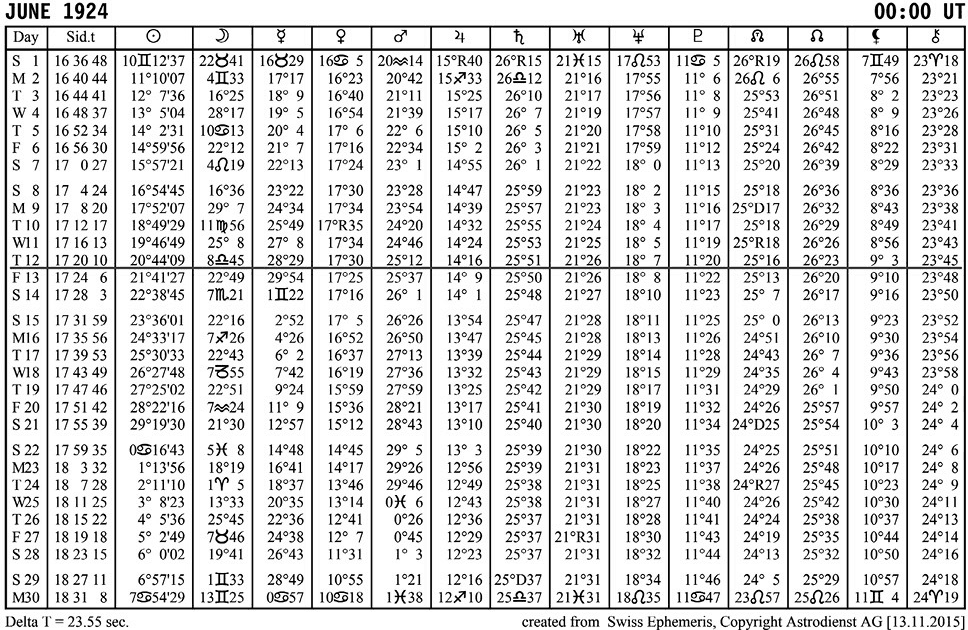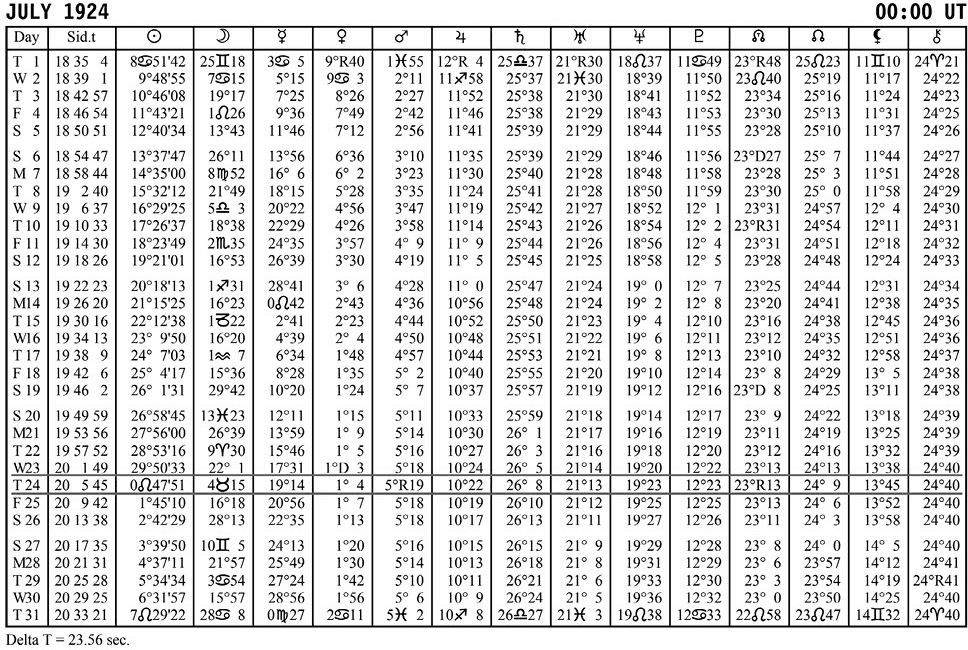 Рис. 4.6. Таблицы эфемерид на июнь и июль 1924 года