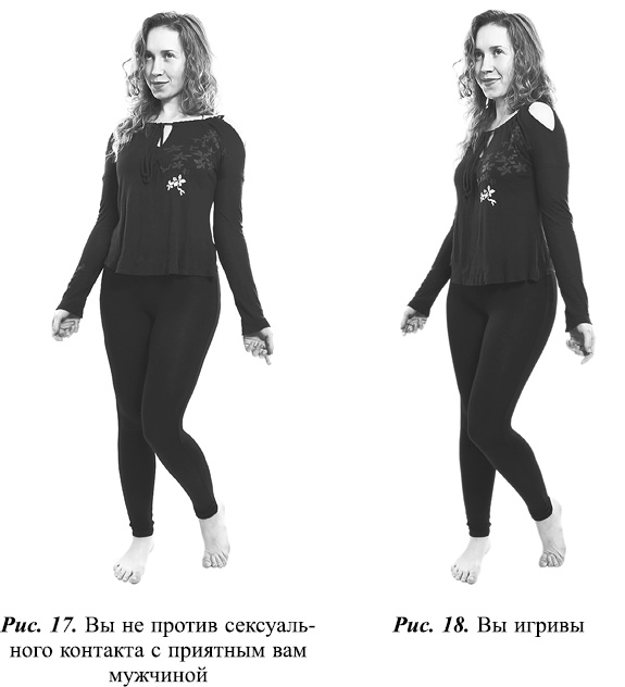 Здесь, в этом вопросе, я спокоен – наши рекомендации направлены, прежде всего, на то, чтобы влюбленные как можно дольше сохраняли искренние чувства друг к другу. Лучше, на всю жизнь. А для этого сначала надо узнать, хорошо ли вам будет вдвоем. Вот тут-то и пригодятся рекомендуемые жесты. Да, вы рассчитываете в дальнейшем на более откровенное поведение партнера, на серьезное приглашение к сексу с его стороны. Но этот ваш расчет хорошо скрыт и от него, и от окружающих. Поверьте, ваше поведение ничем не будет отличаться от естественного поведения большинства женщин-прелестниц, вызывающих мужское влечение (рис. 17–18).
