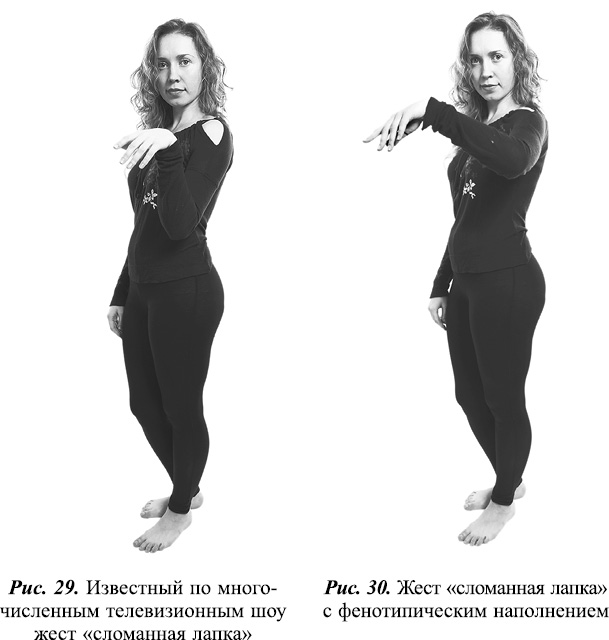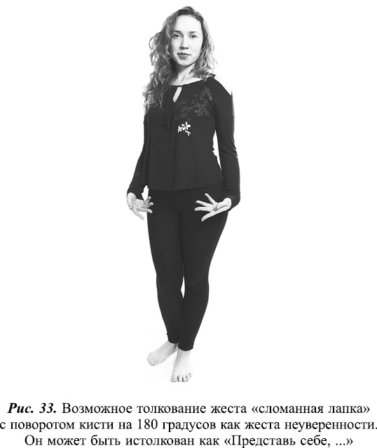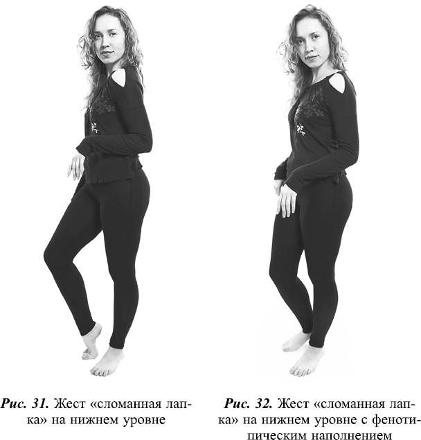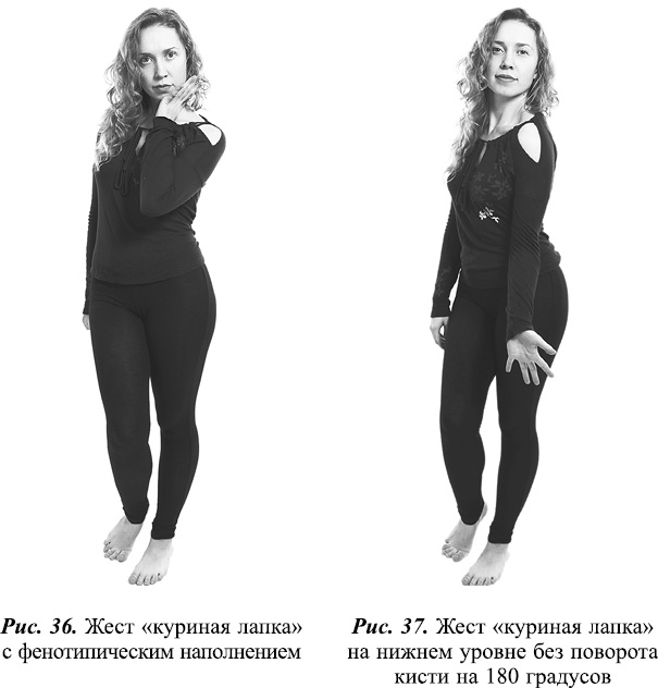 Жест «сломанная лапка» с поворотом кисти на 180 градусов выполняется на нижнем уровне потому, что на уровне торса он может выглядеть как жест неуверенности.