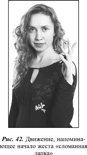 Движение, ему предшествующее, тоже не женское. Особенно, с точки зрения течения энергии в теле человека. А теперь попробуем, базируясь на этом жесте, выполнить движение, которое напоминает начало жеста «сломанная лапка» (рис. 42).