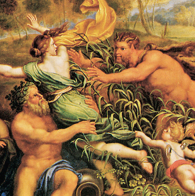 Пан увидал однажды Сирингу и хотел подойти к ней. Взглянула на Пана нимфа и в страхе обратилась в бегство. Едва поспевал за ней Пан, стремясь догнать ее. Но вот путь преградила река. Куда бежать нимфе? Простерла к реке Сиринга руки и стала молить бога реки спасти ее. Бог реки внял мольбам нимфы и превратил ее в тростник. Подбежавший Пан хотел уже обнять Сирингу, но обнял лишь гибкий, тихо шелестевший тростник. Стоит Пан, печально вздыхая, и слышится ему в нежном шелесте тростника прощальный привет прекрасной Сиринги. Срезал несколько тростинок Пан и сделал из них сладкозвучную свирель, скрепив неравные коленца тростника воском. Назвал Пан в память нимфы свирель сирингой. С тех пор Пан любит играть в уединении лесов на свирели-сиринге, оглашая ее нежными звуками окрестные горы.