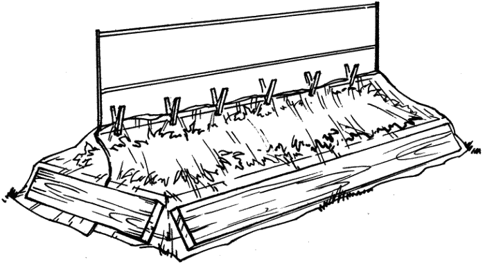 2. По шнурам выкапывается траншея глубиной в штык, и не нужно ее особо ровнять и углублять дно. Ровными должны быть только стенки. Чтобы трава не врастала в траншею, в междурядьях кладутся полосы пленки, края которой опускаются в траншеи на 7 – 10 см. Полосы прикрываются вынутой землей, которая позже разбивается и растаптывается тонким слоем. Сорняки тут расти не будут: очень сухо. Траншея заполняется органикой: вниз – навоз или растительные остатки, песок, земля и минеральная добавка (калий, фосфор и кальций), сверху – слой готового компоста.