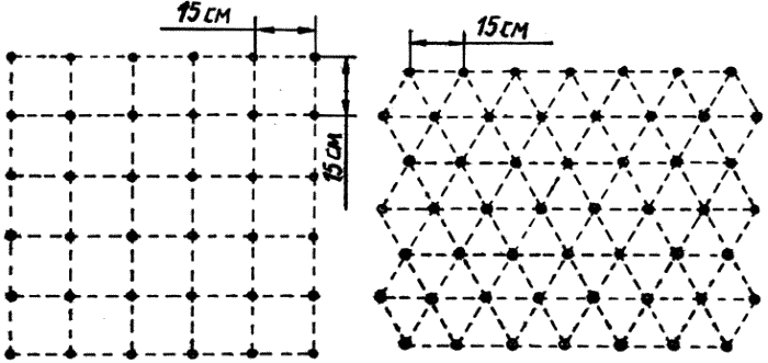 2. И в рядках, и на всей грядке применяется более рациональное расположение растений: не напротив, в углах квадрата, а со сдвигом, в углах треугольника («в шахматном порядке»). Так на площади вмещается больше растений. Строчные овощи – салаты, корнеплоды – прореживаются также с учетом такого расположения (рис. 61).