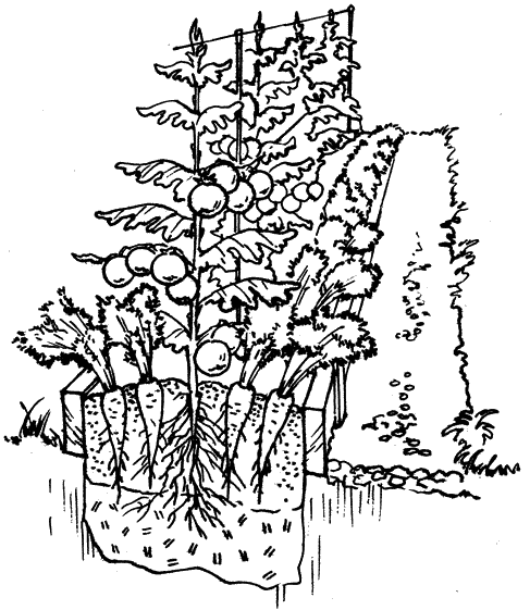 Разумеется, это не догма. На юге, если уж очень мало земли, проходы можно сузить до 80 см, но только на открытом месте, где никогда не падает тень. А фермеры, справедливо экономя землю, сужают проходы до тех же 50 см. Например, омский овощевод Олег Телепов. Его проходы – сплошные компостники (рис. 59). Летом тут протиснешься с трудом, но овощи качественные, а выход с площади – предельный.