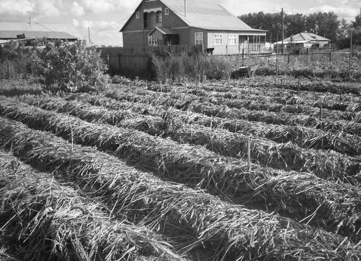 Позже Олег окультурил пырейную целину по-иному: летом укрыл ее подстилкой из курятника слоем в 15 см и оставил так до весны. Подстилка рыхлая: полова, солома, а помета – процентов пять, как раз для хорошего гниения. В мае скосил дружный ковер сорняков и высадил рассаду помидоров. В лунках было видно: корни пырея сгнили, образовался перегной. Поливать помидоры тем летом не пришлось: влаги под такой мульчей было вдоволь.