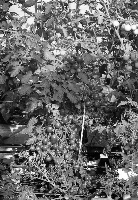 Результат: зимняя ночная температура на 8 – 10 °C выше, чем в обычной теплице. Когда рядом, в наземной пленочной теплице без подогрева все мерзнет, в траншейных теплицах всегда плюс. В самые холодные ночи достаточно укрыть растения спанбондом. Даже в очень морозную зиму 2006 полы в траншеях оставались незамерзшими. Плетистые томаты плодоносят до середины декабря, давая очень вкусные плоды. На рис. 121 – куст черри в конце ноября. Ремонтантная малина, высаженная на размножку, отдала последний урожай 31 декабря!