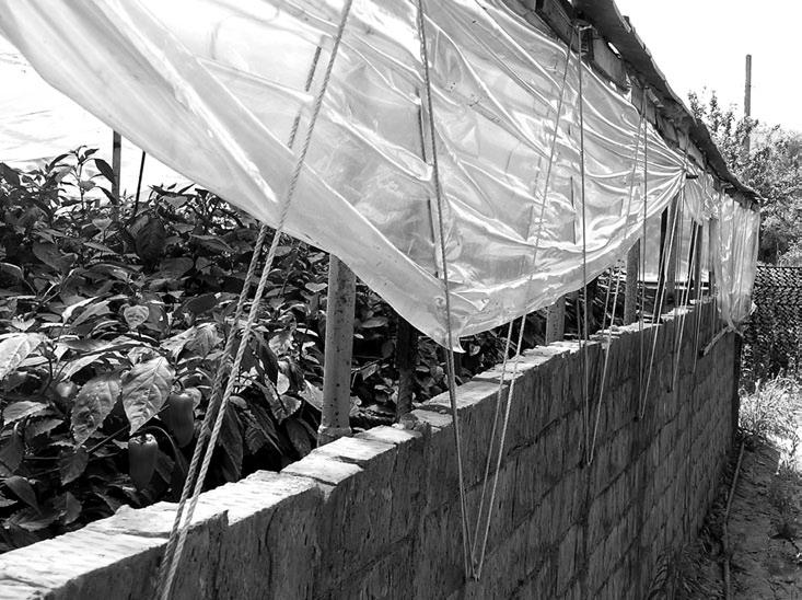 Вся верхняя часть боковых стен – форточка. Кровля почти плоская, и «борта» дают нормальную вентиляцию. Вентиляция регулируется остроумнейшим способом – за секунды. На рис. 123 видно: пленка свободно скользит между двух веревок. Снизу в нее впаян старый кабель – для тяжести. Чтобы поднять пленку, достаточно передвинуть вверх по веревкам прищепку (рис. 127).