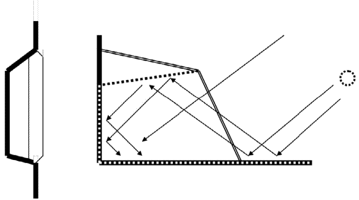 1. Профессор Росси разработал форму теплицы, максимально улавливающую излучение при низком стоянии Солнца. Нет предела человеческому уму! Оказывается, отражатели можно использовать не только внутри, но и снаружи (рис. 120)! Получается «теплица-рефлектор». В снеговых регионах наружным отражателем служит снег. Южане могут и белую плиточку перед тепличкой постелить. А внутренние отражатели – белая краска или зеркальные пленки (отражающие поверхности обозначены пунктиром).
