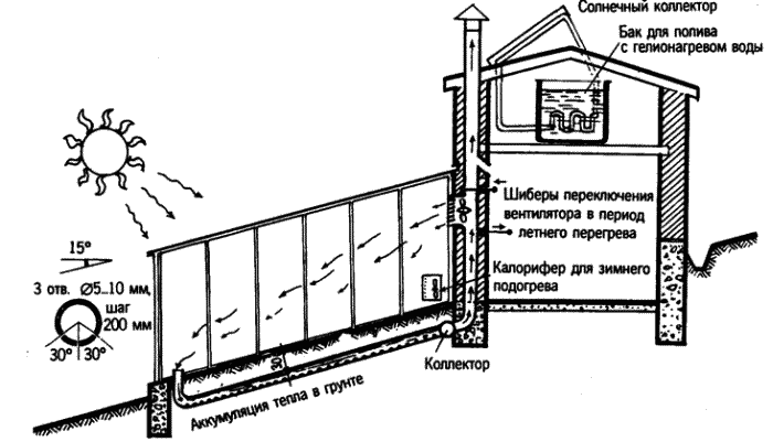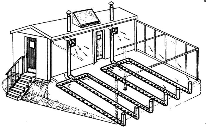 Под почвой, на глубине 30–35 см, через 55–60 см друг от друга, вдоль всей теплицы лежат пластиковые (или асбоцементные) трубы (рис. 132). Нижние их концы выведены на поверхность и прикрыты от мусора сеточкой. Верхние (северные) концы соединены в один поперечный коллектор. Из коллектора идет вертикальная труба-стояк, проложенный в капитальной стене. Она выходит на крышу, но не напрямую, а сквозь регулировочную камеру. Камера открывается в теплицу примерно на высоте 1,5 м. Снизу и сверху она ограничена заслонками, а выход в теплицу – вентиляторный. Как показали опыты наших природников, вентиляторы нужны весьма мощные, а трубы – не тоньше 150 мм.