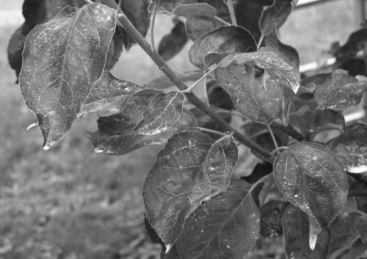 ПУРШЕЙД – защитник от солнечной радиации. Карбонат кальция, т. е. мел хитрого помола плюс немного нетоксичных добавок. Работает аналогично крему от загара. Частицы препарата – микропризмы, отражающие 90 % УФ-лучей и ИК-излучения, то есть жарищи. Остальной свет пропускают. Перегрев листьев снижается на 3–5 ºС. Дневного стресса нет, фотосинтез повышенный. Добавлена формула «мокрого обогащения» – препарат не оседает, не засоряет форсунки, легко отмывается. Тем не менее, хорошо держится на дожде (рис. 201 и 202).
