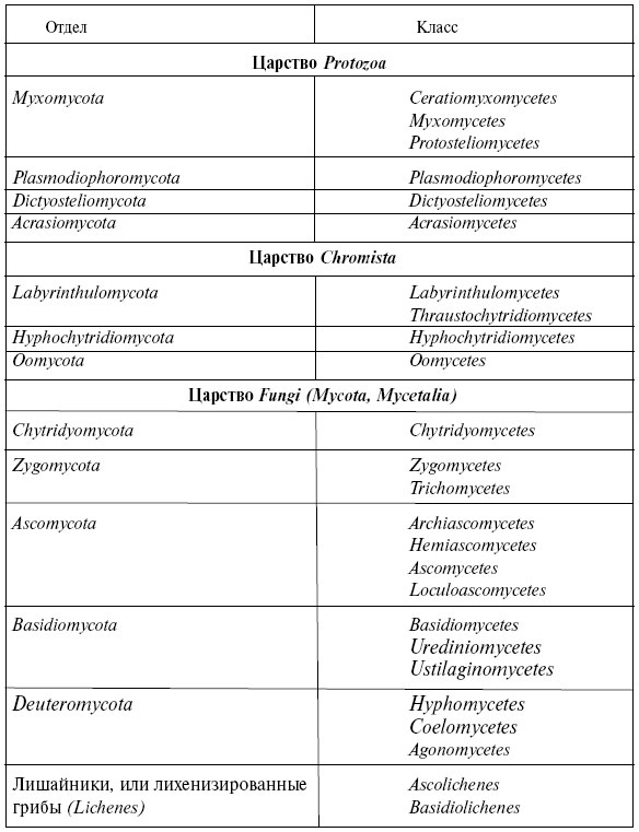 По сочетанию основных признаков (подвижность, строение зооспор и гамет, состав клеточной стенки, путь синтеза лизина и др.) традиционно относящиеся к грибам организмы в настоящее время разделены на три самостоятельные эволюционные линии и распределены по трем царствам живой природы – Протозоа (Protozoa), Хромиста (Chromista) и Настоящие грибы (Fungi) (табл. 2.1).