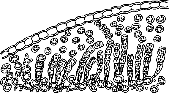 Рис. 2.6. Albugo Candida. Спорангиеносец со спорангиями под эпидермисом листа
