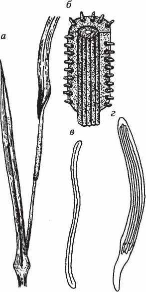 Рис. 2.27. Epichloe typhina: а - внешний вид поражения; б - разрез через строму; в – спора; г – сумка со спорами