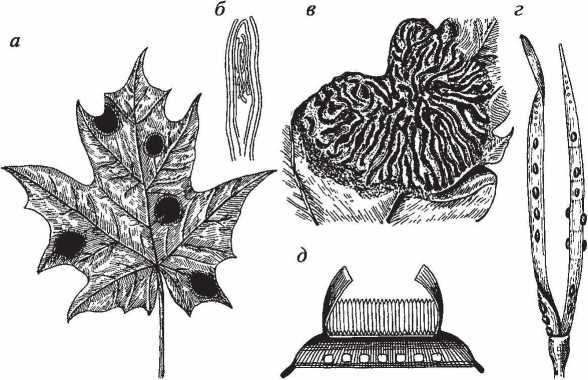Рис. 2.28. Rlivtisma acerinuin (а – пораженный лист клена; б – сумка со спорами; в – апотеций в строме) и Lophodermium pinastri (г – апотеции на хвое сосны; д – разрез апотеция)
