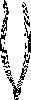 Род лофодермиум (Lophodermium) объединяет грибы с погруженными в ткань растения апотециями, линейными или удлиненными, раскрывающимися при созревании широкой продольной щелью и отделенные друг от друга черточками (см. рис. 2.28, г, д). В зрелых апотециях образуется слой булавовидных сумок, разделенных нитевидными парафизами и содержащих длинные нитевидные споры.