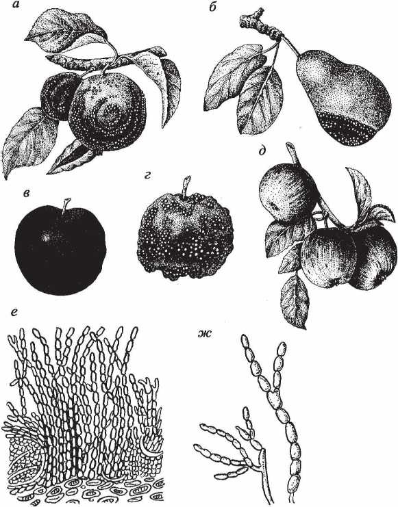 Рис. 2.31. Monilinia fructigena: а, б - пораженные плоды яблони и груши соответственно; в – мумифицированный плод яблони; г – то же с образованием апотециев; д - здоровые плоды яблони; в – конидиальная стадия – Monilia; ж - отдельные конидиеносцы