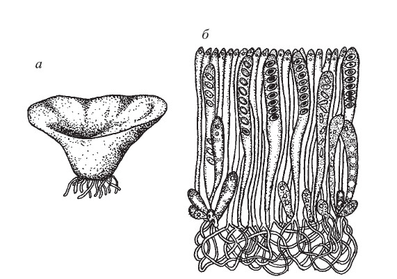 Рис. 2.32. Peziza: а - плодовое тело; б – разрез через гимений (видны сумки и парафизы)