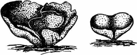 Род гиромитра, или строчок (Gyromitra), имеет крупные мясистые шоколадно-коричневые шляпки, диаметр которых достигает 20 – 30 см. Шляпка неправильно-округлая, с глубокими складками, часто срастается с ножкой. Ножка обычно короткая, полая, белая, иногда с фиолетовым оттенком (рис. 2.36).