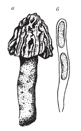 Рис. 2.35. Verpa bohemica: a -общий вид; б – сумка со спорами