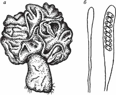 Рис. 2.36. Gyromitra esculenta: a – общий вид; б - сумка со спорами и парафиза