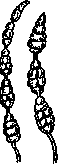 У грибов рода альтернария (Altemaria) мицелий обычно окрашен в оливковые или оливково-бурые тона, нередко в молодом возрасте бесцветный. Конидиеносцы простые одиночные или в пучках. Конидии многоклеточные, темноокрашенные, обратнояйцевидные или обратнобулавовидные, с поперечными или продольными перегородками, одиночные или собраны в цепочки. У вершины вытянуты в более светлую шейку, часто с поперечными перегородками, нередко нитевидными (рис. 2.53). Строение и форма конидий служат основным систематическим признаком