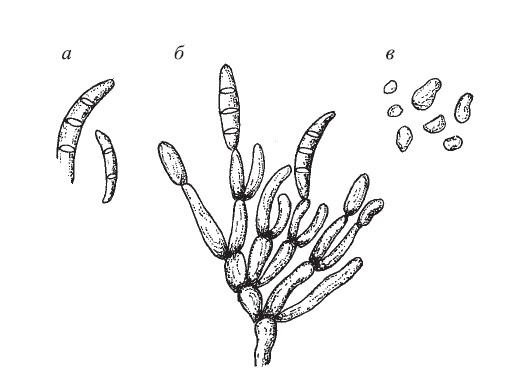 Рас 2.54. Fusariuin:а – макроконидии; б – конидиеносец с конидиями; в – микроконидии