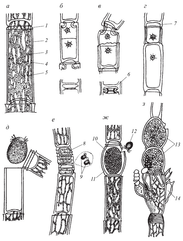 Рис. 1.54. Oedogonium: а – строение клетки (1 – колпачок; 2 – клеточная стенка; 3 – хроматофор; 4 – пиреноид; 5 – ядро); б, е, г- деление клетки с образованием валика (6) и колпачка (7); д - выход зооспоры; в – нить с антеридиями (5) и сперматозоидами (9); ж - оплодотворение яйцеклетки (10) в оогонии (11) сперматозоидом (12); з - водоросли с оогониями (13) и мужскими карликовыми растеньицами – наннадриями (14)