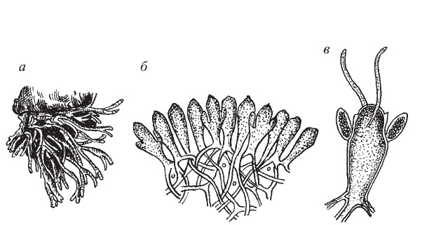 Рис. 1.56. Сodium: a - внешний вид таллома; б - часть поперечного разреза таллома; в - кортикальный пузырь с гаметангиями