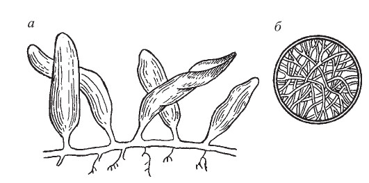 Рис. 1.57. Caulerpa: а – внешний вид талаома; б – поперечный разрез таллома