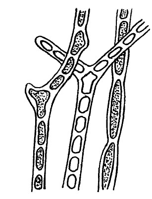 1. Ознакомиться с внешним видом кладофоры. Обратить внимание на крупные войлочные дерновинки темно-зеленого цвета, жесткость нити водоросли из-за отсутствия слизистого чехла. Приготовить препарат, рассмотреть при малом увеличении микроскопа и зарисовать часть ветвящегося таллома. Отметить дифференцировку тела на главную ось и боковые ветви, на сегменты с зооспорангиями и гаметангиями.