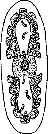 Полость клетки заполнена большой вакуолью. В центре клетки находится крупное ядро с ядрышком, заключенное в цитоплазматический мешочек и подвешенное на цитоплазматических тяжах.