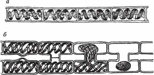 Рис. 1.62. Spirogyra: а – общий вид нити; б – лестничная конъюгация