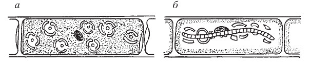Рис. 1.64. Mougeotia. Участок нити: а - пластинка хроматофора в плане; б - хроматофор повернут и виден в профиль