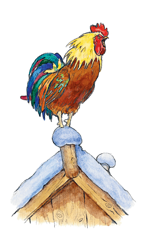Хочется петушку хоть одним глазком взглянуть на санки-самокатки, да думает себе: «Нет, не выгляну! Уйдёт лиса, тогда погляжу!» Запела было опять лиса свою песню, а петушок ей и говорит: