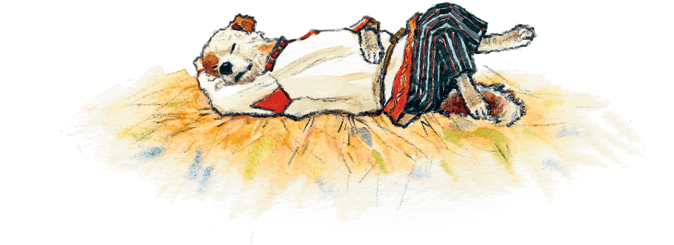 Стали вчетвером тёмную ночь коротать. Медведь под стогом, мурлыка на стогу, а козёл с бараном у огня. Заснули медведь, козёл да баран, дремлют, а котишка-мурлышка один не спит и всё видит.