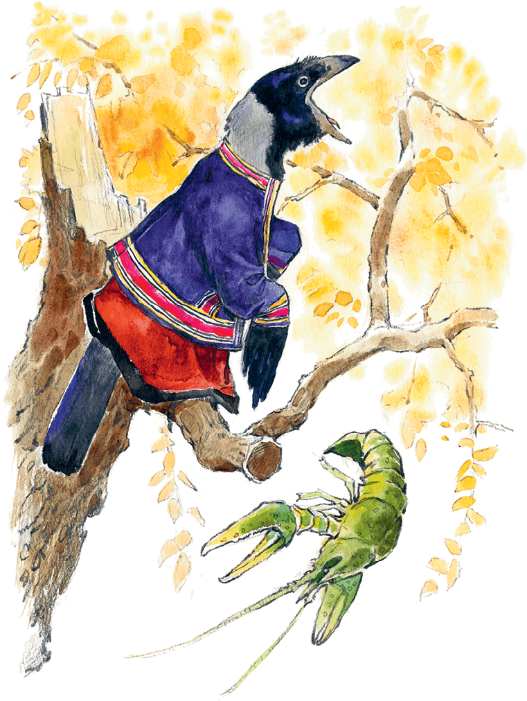 – Ага! – крикнула ворона во весь рот и уронила рака в воду.