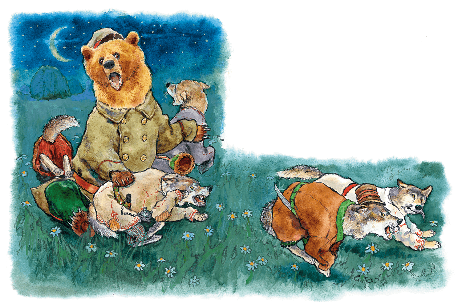 И видит он, идут семь волков серых, восьмой волк белый, и прямо к огню!