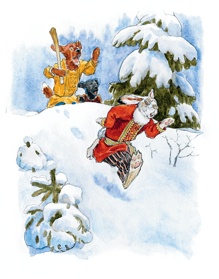А собаки увидели зайца, бросили ворону да побежали за зайцем. Заяц быстро бежал – собаки гнались за ним, гнались, совсем выбились из сил и отстали от него.