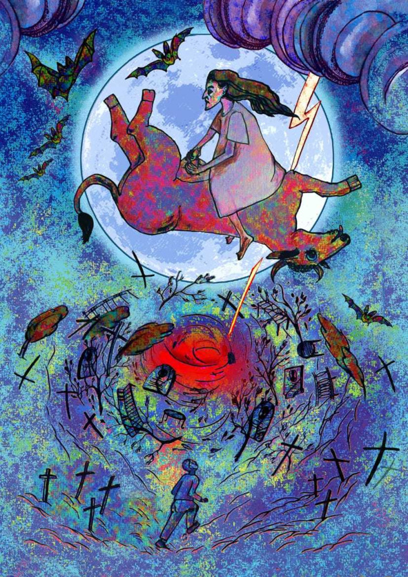 Ветер подул еще сильней, вырывая с корнем деревья, поднимая их сразу вверх, затягивая в воронку вихря. Вся почва земли, размытая дождём, и большой поток воды, всё стремительно неслось вместе с Сергеем в огромную, черную, глубокую дыру, образовавшуюся в земле, на дне которой, было уже, огненное, сияющее красным светом, раскалённое пекло Ада, длинным, круглым в диаметре, ровным тоннелем, уходящим глубоко в землю. Гул и свист ветра, сравнялся в одну голосовую линию с многоголосым писком, внезапно появившихся, большущей стаей, летучих мышей, которые были в таком огромном количестве, что затмили своими маленькими тельцами, и без того темное небо, от черных туч. Они растянулись в небе с левой и правой стороны от ведьмы, держа ее в центре своего летучего движения, размахивая своими мерзкими крыльями, похожими, своею формою на маленький зонт.