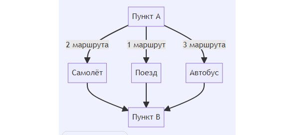 Пример 1.Допустим, что нам необходимо добраться из пункта А в пункт Б. При этом, это можно сделать различными способами (смотрите схему 1):