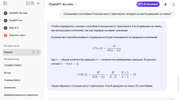 Закончить такой своеобразный обзор возможностей нейросетей по решению примеров и задач комбинаторики небольшим тестом.