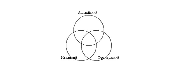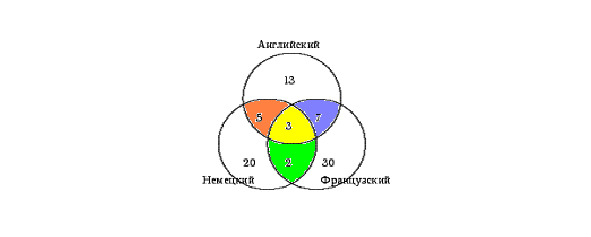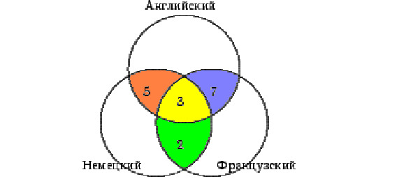 Выразим условие этой задачи графически. Обозначим одним кругом тех, кто знает английский, другим кругом – тех, кто знает французский, и третьим кругом – тех, кто знают немецкий.